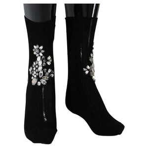 Dolce & Gabbana Black Knitted Floral Clear Crystal Socks