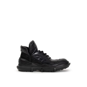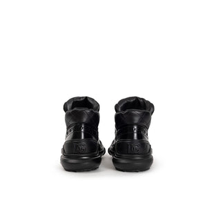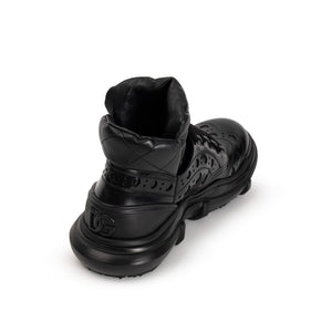 Dolce & Gabbana Black Leather Allumin Glove Derby Shoe. Safety shoe model, front lace-up fastening, tone-on-tone Derby-inspired workmanship, oversized outer sole, tongue and back in quilted leather. Tone-on-tone logo printed on the back.