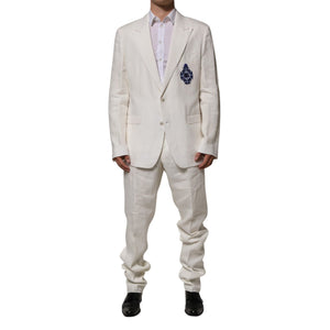 Dolce & Gabbana Light Cream Linen Embroidered 2 Piece Suit with DG crest patch, two-button closure, tailored fit, formal wear for luxury occasions.