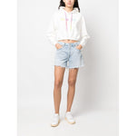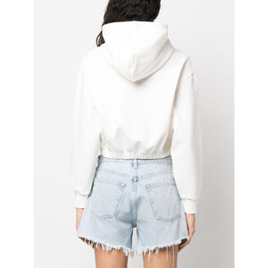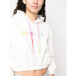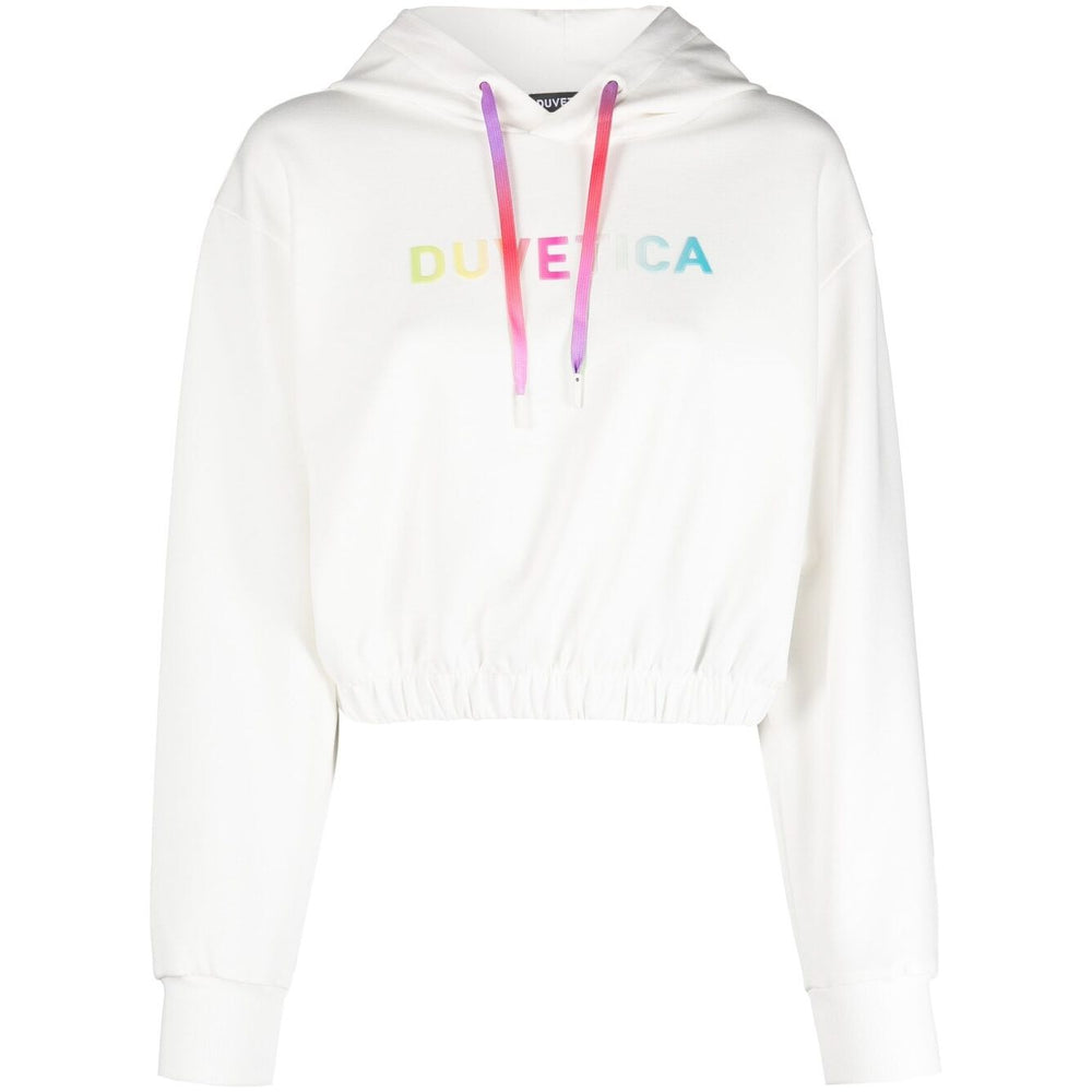 logo-print cropped hoodie from DUVETICA featuring off-white, logo print to the front, drawstring hood, long sleeves, ribbed cuffs, cropped and elasticated hem. Logo hoodie Size and Fit - This piece fits true to size. We recommend you get your regular size. Model is 1,75m / 5ft 8in wearing size S