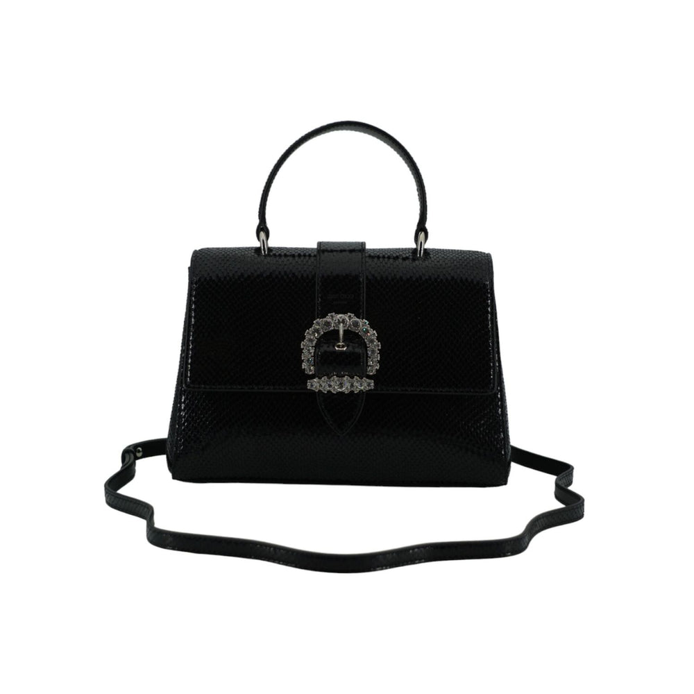 Details: Handbag realised in calf leather. With removable leather shoulder strap and magnetic button closure under the flap. With Cristal detailed hardware. Three main compartments and internal zip pocket.