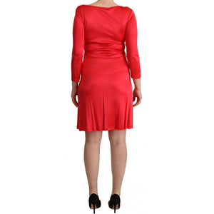 John Galliano Red Viscose 3/4 Sleeves Deep Round Neck Sheath Dress
