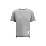 T-Shirt by Thom Browne made from cotton, with a ribbed crew neck for extra comfort. The model features an applied logo patch on the front and adjustable side slits with buttons, enhanced by the detail of the iconic colored bands. On the back panel stand out the characteristic colored vertical bands in the center, a distinctive symbol of the brand. A casual and contemporary garment, perfect for adding a unique touch of style to your wardrobe.