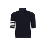 Thom Browne’s Virgin Wool Turtleneck Sweater is a refined and sophisticated piece that combines elegance with distinctive details. With a ribbed turtleneck and short sleeves, it features a monochrome pattern enhanced by contrasting hems. The brand’s iconic bands on the left sleeve and the ribbed hem with slight side slits add a touch of originality.