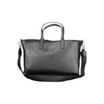 Step into the world of eco-chic luxury with the Tommy Hilfiger handbag that’s as functional as it is stylish. Crafted with recycled polyester, this sleek black tote boasts two handles and a removable shoulder strap for versatile carrying options. Two spacious compartments, a central pocket, and additional internal pockets keep your essentials organized. Contrasting details and the iconic Hilfiger logo lend an air of distinguished flair, while protective feet assure your investment is well-guarded. Make a statement with this environmentally-conscious accessory.