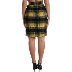 Dolce & Gabbana Yellow Black Brushed Checked Wool Pencil Cut Skirt